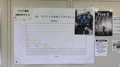 教室移動の際には、サブバッグを使用するよう呼びかけています。毎日、サブバッグを持ってきていない人を調べ、その結果をグラフにまとめています。また、「5日間連続で持ってきていない人が0人」、通称 「five0」 を目標に、各クラスで取り組みを進めています。達成したクラスは、その後も継続して毎日サブバッグを持参し、「永遠のゼロ」を目指してしっかり活用することを心がけましょう。
