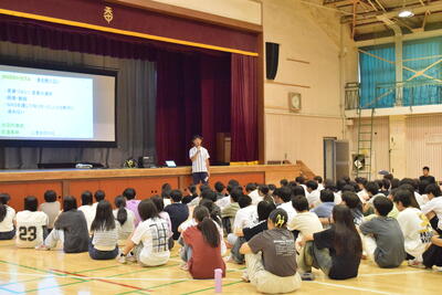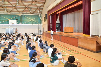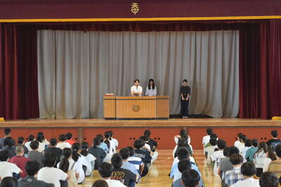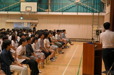 3年生は下向いていたり、姿勢が悪く聴いている人がおらず、意識の高さが様子から伝わってきます。夏休みには塾等の講習会で大変な日が続くと思いますが、頑張ってほしいと思います。よく、高校受験では「受験は団体戦」という言葉が使われます。