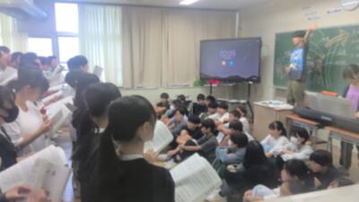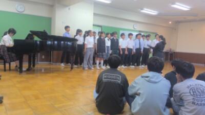 今日の6校時の1年C組の合唱練習の後半は、視聴覚室で練習している3年B組と交流させてもらいました。