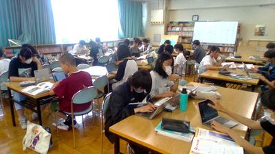 図書館で気象災害についての調べ学習をしています。