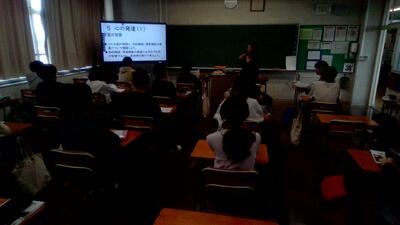 エチオピア出身のティンベタさんは文化や言葉、日本の印象などについて話をしてくれました。生徒はスライドを興味深そうに見ていました。