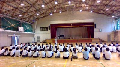 生徒朝会で全校生徒に挨拶をした後、クラスで自己紹介をしました。