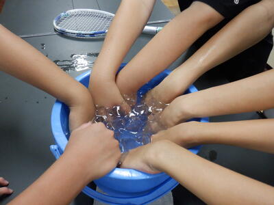 こまめに水分補給したり、冷房の効いた部屋や日陰で休んだり、バケツに入れた氷水で手首を冷やしたりしながら、練習をおこないました。