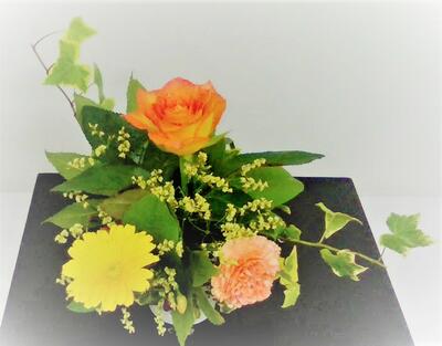 本日、使用した花材は、カーネーション、バラ、ガーベラ、スターチス、レモンリーフ、トウガラシ、ヤツデ、アイビーです。ハロウィン仕様になっています。