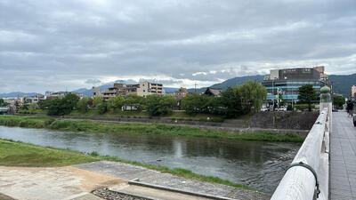 三条大橋から、京阪三条駅方面をみた鴨川の流れです。