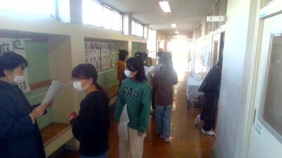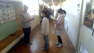 9日の③④時間目に、3年生が各教室で一斉に書初めを行いました。止め、はね、はらいなどに注意して、丁寧に書くことを意識しました。楷書は「志を遂げる」、行書は「穏やかな海」でどちらも5文字!です。私も書いてみましたが、5文字はバランスを取るのが本当に難しいです。廊下に生徒の力作が並び、新春らしい風情になりました。