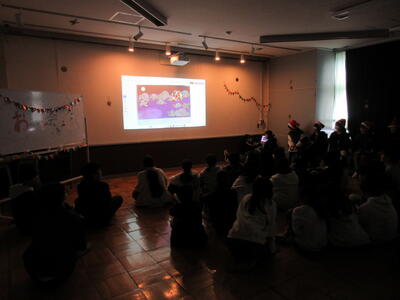 12月22日(月)の昼休み、図書委員会はクリスマスお話会を実施しました。飾りつけをした視聴覚室で、『エルマーとサンタさん』を読み、約60人が集まりました。情感あふれる朗読の合間に、ゾウの鳴き声や鈴の音など効果音も入り、クリスマス気分を盛り上げていました。