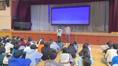 1校時は体育館で2年生の校外学習の発表会を1年生に向けて代表班が行っていました。