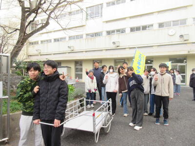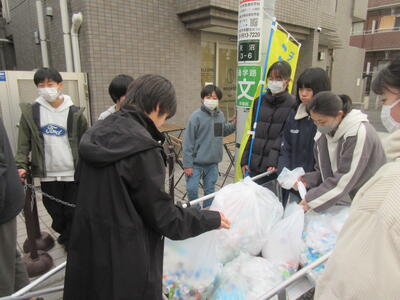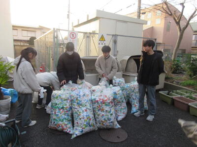 3月6日の放課後、地域の方々と生徒会、ボランティア生徒でペットボトルキャップの回収「エコキャップ運動」を行いました。今回、生徒会の呼びかけに応えて集まった生徒は全部で32名。3班に分かれて教員地域の方と一緒にペットボトルキャップの集積所を回りました。