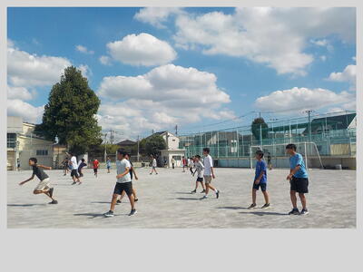昼休み、校庭で元気にサッカーをする生徒たち。思いっきり、走り回っていました。