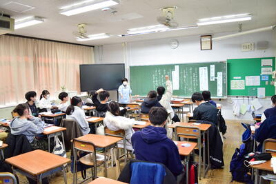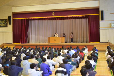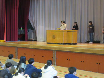 1校時の学級活動の時間では、1年生が学年レクリエーションを実施しました。本来は12月末に学年委員が中心となって企画していたものですが、欠席生徒が多くなっていたこともあり、今日に延期したものでした。学年委員の頑張りに応えるように、1年生の皆も楽しそうに参加している様子がありました。こういった企画を成功させていくことも、本校の教育目標である「自主」「自律」「共生」の実現につながります。大切にしていきたい活動の一つです。
