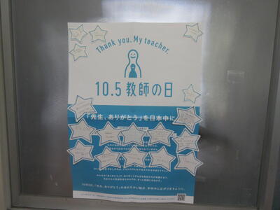 話は変わりますが10月5日は「教師の日」だそうです。PTAの方々がPTA室の前にポスターを張り、先生たちにメッセージを贈ってくれました。