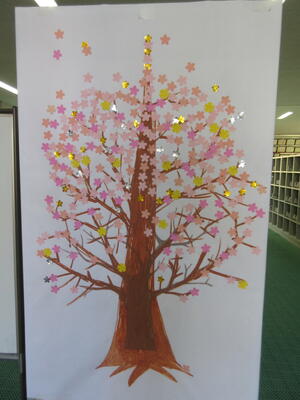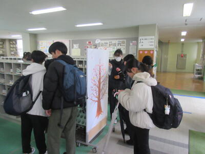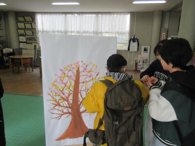 生徒会役員や委員会の生徒が登校した生徒とあいさつをすると花が渡されます。その花を貼って咲かせるあいさつの花は現在は7分咲きといったところです。